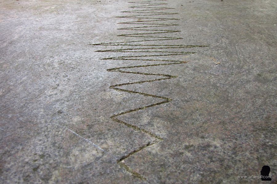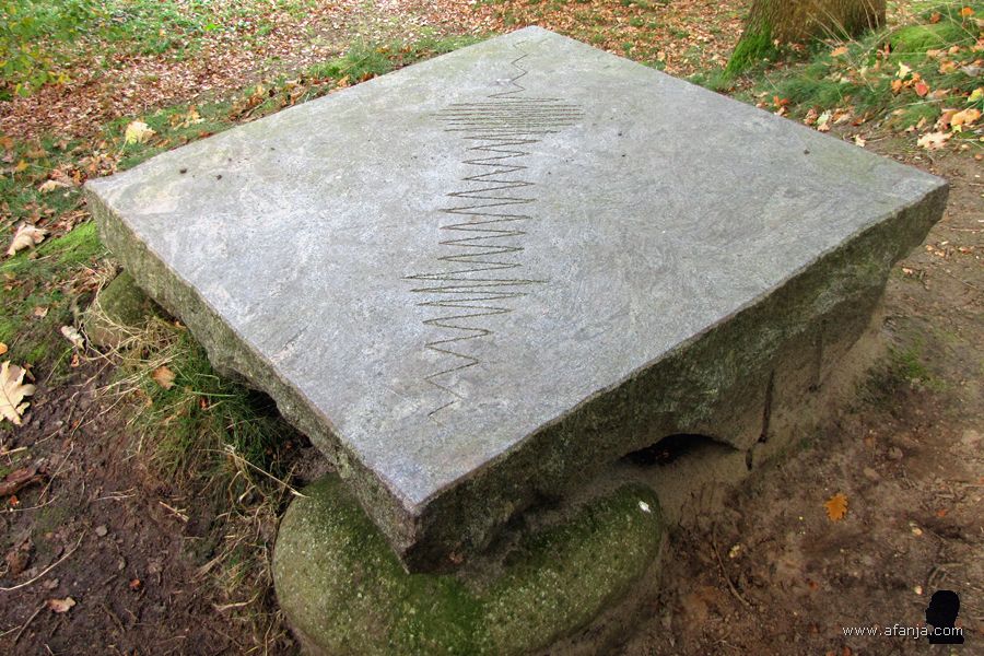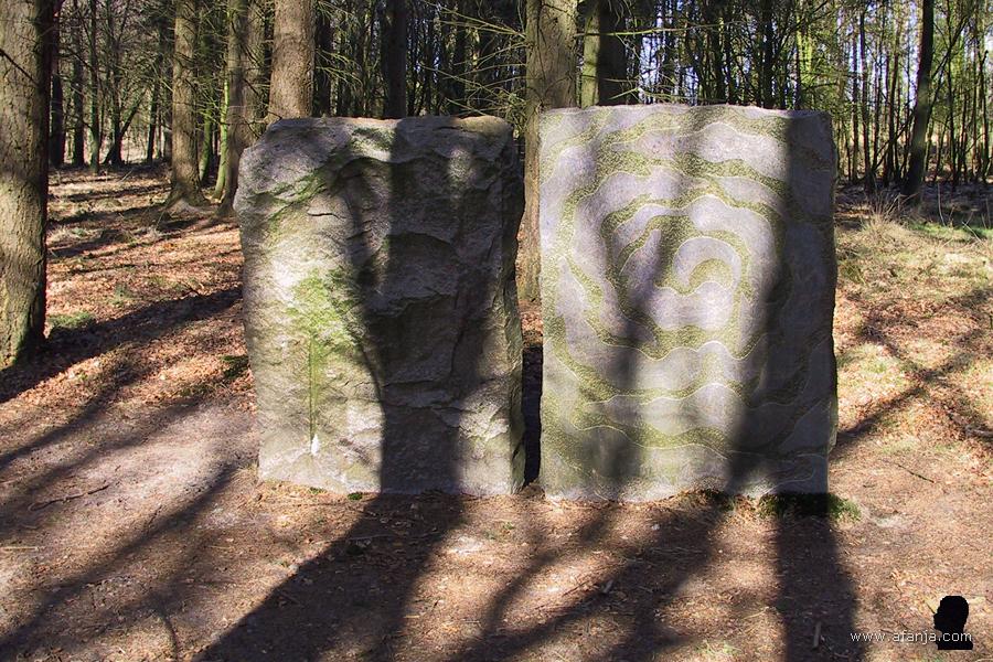 Het tweede kunstwerk uit deze serie heb ik in 2003 al eens gefotografeerd in het Ketliker Skar, toen ik er toevallig langs kwam. Eigenlijk zou ik die plek nog eens weer moeten opzoeken. Op de rechterhelft van dit monument is een roedel om elkaar heen draaien wolven te zien. De linkerhelft vraagt om nader onderzoek. Maar ik heb geen idee van de exacte locatie, dus het is maar de vraag of het nog wel bereikbaar is voor mij. …