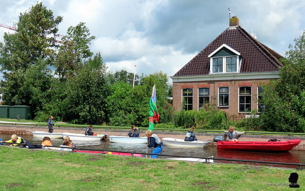 Bij een sluis doen zich regelmatig leuke momenten voor. Hoewel ik dat niet direct had verwacht, ontbrak ook hier de komische noot niet. Eén van de kinderen keek eens om zich heen en ontdekte daarbij, dat hij de enige was bij wie de mast nog fier overeind stond. ‘Juf, mijn mast …,’ zei hij naar boven wijzend, ‘wat moet ik nu doen?’ ‘Dan haal je hem nu maar naar beneden …,’ luidde de reactie.