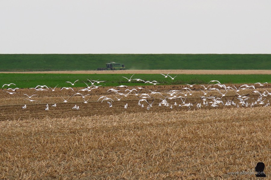 Iets verderop leek nog een combine met de graanoogst bezig te zijn. Maar het ging het me op de onderstaande foto niet om die combine, maar om de vogels die de aardappelrooiers vergezellen. Waar op het land wordt gewerkt, daar zijn ook vrijwel altijd vogels te vinden …