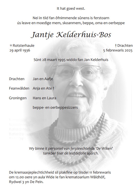 Na een bijzondere week kunnen we terugkijken op een mooi compact en persoonlijk afscheid van mem gisteren. Hoewel er niet veel sneeuw meer lag tijdens de laatste rit naar het crematorium, zorgde dat witte laagje toch voor een bijzonder sfeertje. Mem zou het mooi gevonden hebben, want ze vond het vooral de laatste jaren zo lekker licht als er wat sneeuw lag …