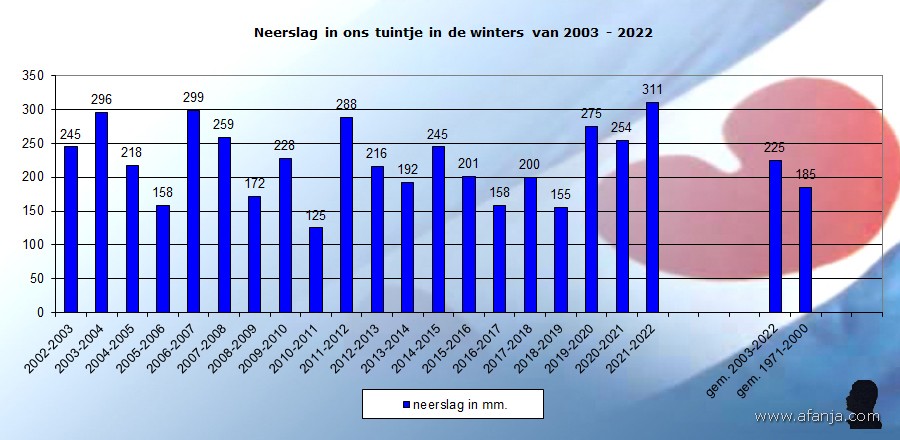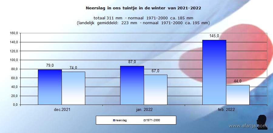 Wat we aan vorst en kou tekort zijn gekomen, kregen we teveel aan regen. In december viel met 79 mm nog ongeveer de normale hoeveelheid regen. Januari was met 87 mm (tegen normaal ca. 67 mm over de periode 1971-2000) al flink aan de natte kant, maar februari was met 145 mm ronduit druipnat. Niet zo gek dus dat deze winter met stip op nr. 1 terecht gekomen is in mijn lijstje met neerslagcijfers in de wintermaanden …