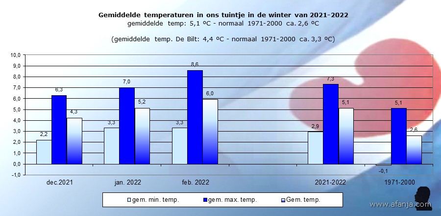 Gewoontegetrouw presenteer ik aan het eind van de winter de weercijfers, zoals ik die in de periode december-februari in ons tuintje heb opgetekend. Over de winter als geheel kan ik eigenlijk vrij kort zijn: ondanks Piet’s Wintervoorspelling 2021-2022 werd het echt een winter van niks …