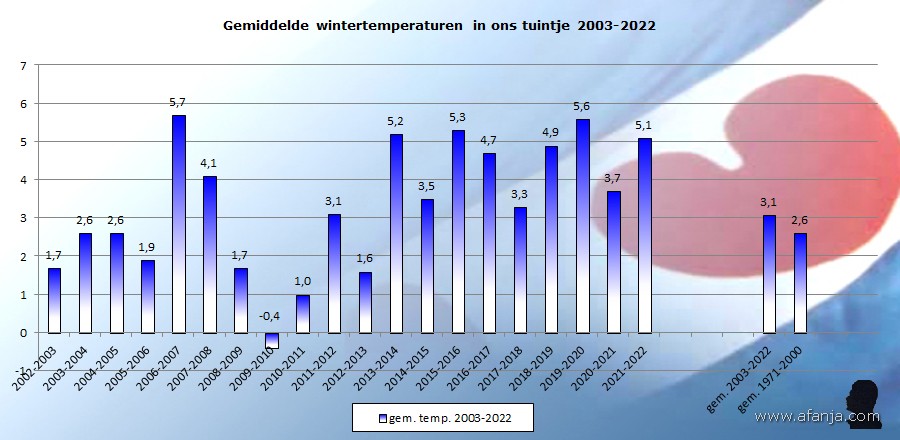 Eerst maar eens kijken naar de temperaturen. In de grafiek linksonder is te zien wat voor armzalige boel het was ditmaal. In de afgelopen winter was december met een gemiddelde temperatuur van 4,3°C de minst warme wintermaand. Januari en februari waren met resp. 5,6°C en 6,0°C nog een stuk warmer. De grafiek rechtsonder laat zien waar de afgelopen winter staat in het rijtje winters vanaf 2003. Daar neemt 2021-2022 de vijfde plaats in …