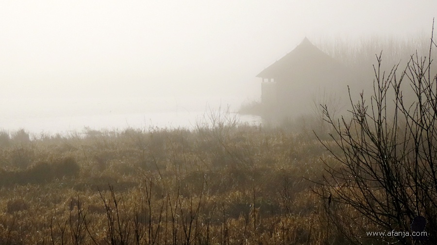 Terug bij de weg besloot ik nog even een stukje in de richting van de windmotor te lopen. Daar vandaan heb ik een foto gemaakt van de vogelkijkhut in de mist …