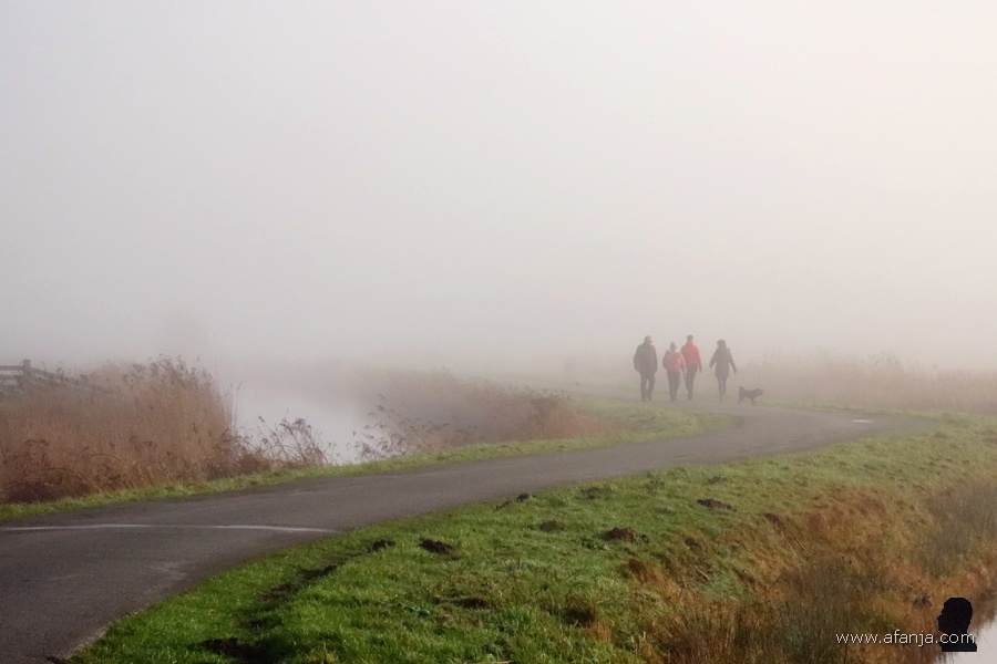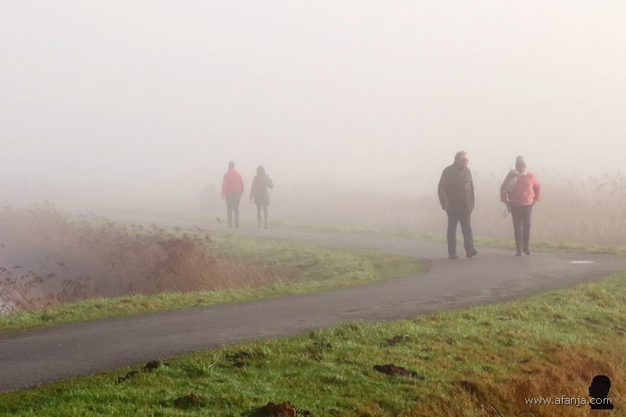 Ik was niet de enige die volop genoot van de rust in het mistige en heerlijk rustige buitengebied van de Jan Durkspolder. Uit de mist doemden vriendelijk groetende wandelaars op …
