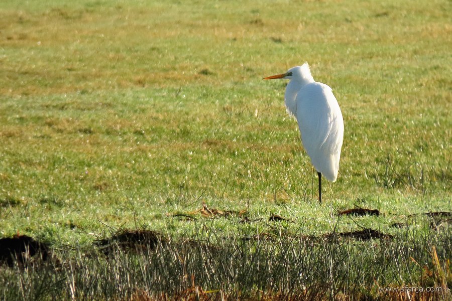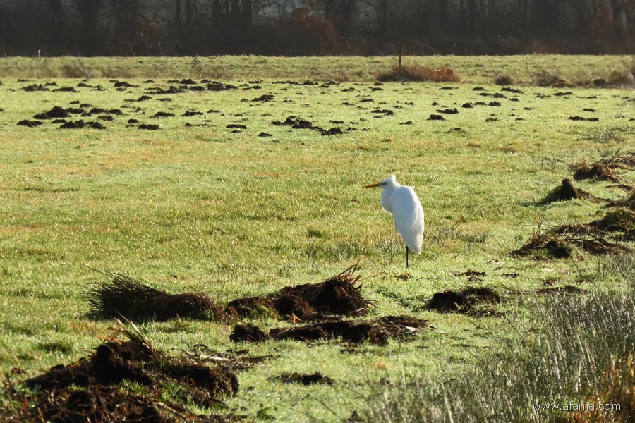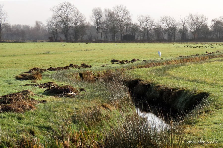 Nadat ik rechtsaf geslagen was, kreeg ik de grote zilverreiger beter in beeld. Op één poot stond hij fier rechtop tussen hekkelafval langs de sloot en molshopen in de verte …