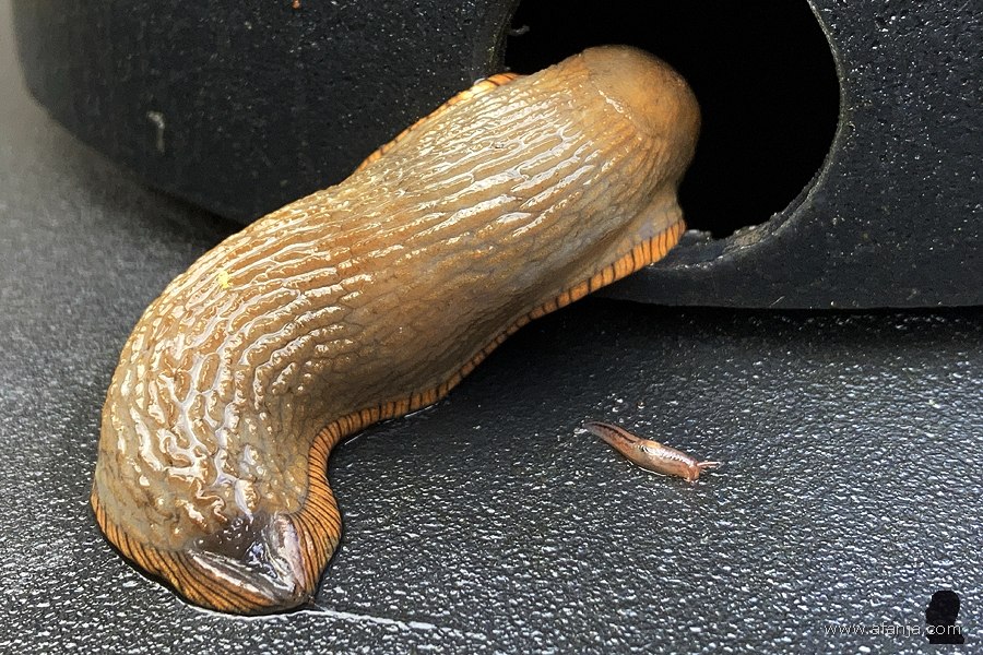 Maar ook beestjes zullen er wel weer voorbij komen. Wat te denken van die hele grote slak, die ik samen met het allerkleinste slakje ooit kon fotografeerde. Of gewoon eens een neergedwarreld herfstblad in de tuin…