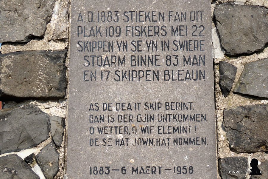 Jetske heeft voor haar blog over deze ramp een mooie foto het beeld “Fiskersfrou” gemaakt. Dit beeld van beeldhouwer Hans Jouta staat een stukje verderop aan de voet van de dijk. De “Fiskersfrou” is een eerbetoon aan de vrouwen van Paesens-Moddergat, die na de ramp van 1883 voor een zware taak stonden: de zorg voor de kinderen en rond zien te komen van een karig inkomen: “De zee heeft gegeven, heeft genomen”.
