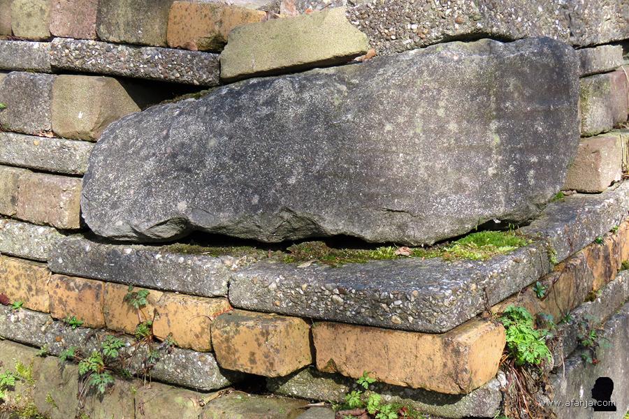 Het is meteen duidelijk dat we in een al wat ouder deel van de Ecokathedraal terecht komen. Hier is duidelijk al meer mos en andere begroeiing tussen de stenen tot leven gekomen dan in het nieuwste deel, dat hier gisteren te zien was. Wat verder opvalt in de onderstaande foto is het brede scala aan materiaal waarmee de Ecokathedraal in de loop der jaren is opgebouwd. Dat varieert van trottoirbanden, stoeptegels en straatstenen tot oudere metselstenen tot ruw, ongepolijst beton …
