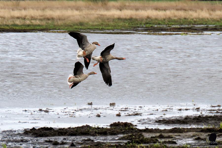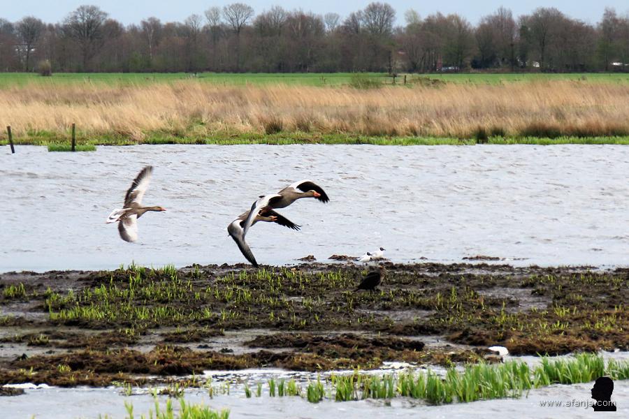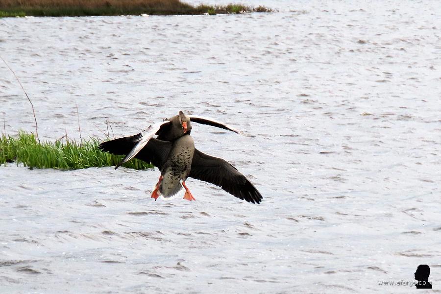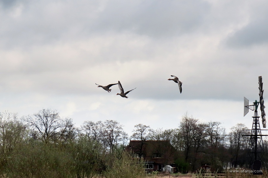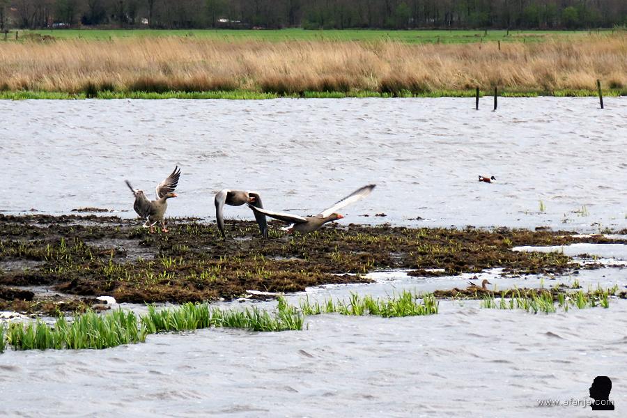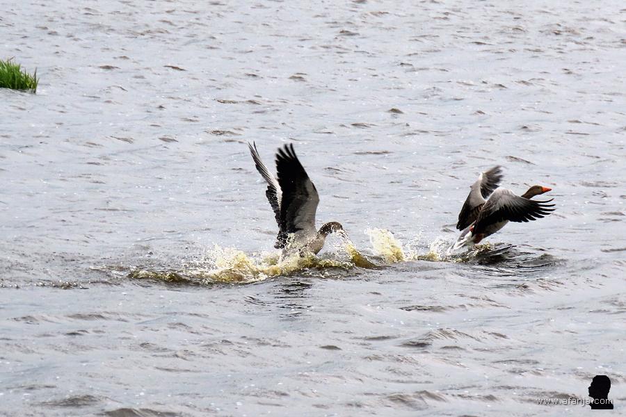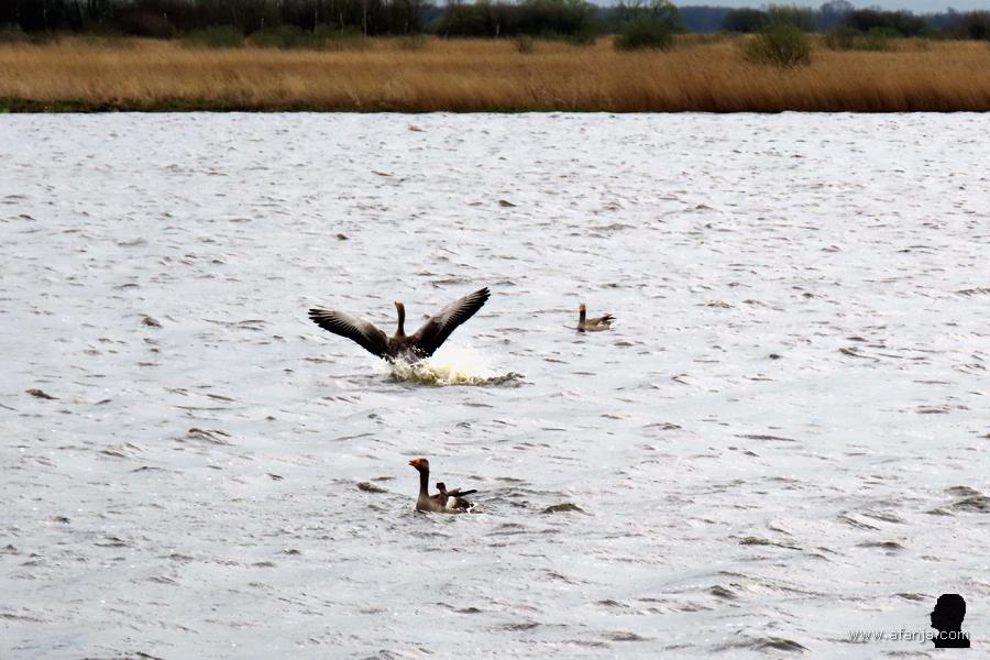 Nadat ze vanaf de windmotor aan de Westersânning aan kwamen vliegen, maakten ze een ruime bocht naar links om aan de oostkant voor de kijkhut langs te vliegen. De derde gans zette boven het eilandje de landing in, maar de andere twee vlogen door. Gans nummer twee kreeg vervolgens nummer één te pakken. Samen raakten ze te water, daar werd de achtervolging voortgezet …