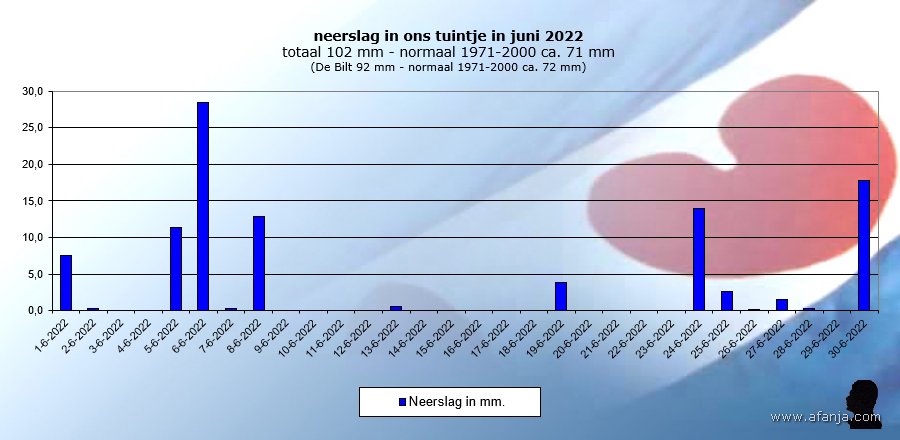 Na een koele start liepen de temperaturen gaandeweg de maand steeds wat verder op. Dat gebeurde gelukkig niet in een egaal stijgende lijn, maar golfsgewijs. Op 23 juni kon ik de eerste tropische 30,1°C in de tuin noteren, daarnaast telde juni 3 zomerse dagen met een maximumtemperatuur van 25°C of hoger. De gemiddelde temperatuur kwam met 16,7°C ruim 2 graden hoger uit dan de gemiddelde 14,4°C in juni over de periode 1971-2000. Met in totaal 102 mm neerslag was het een natte boel, maar vanwege het buiïge karakter waarmee de regen viel, liepen de hoeveelheden regen over het land sterk uiteen …
