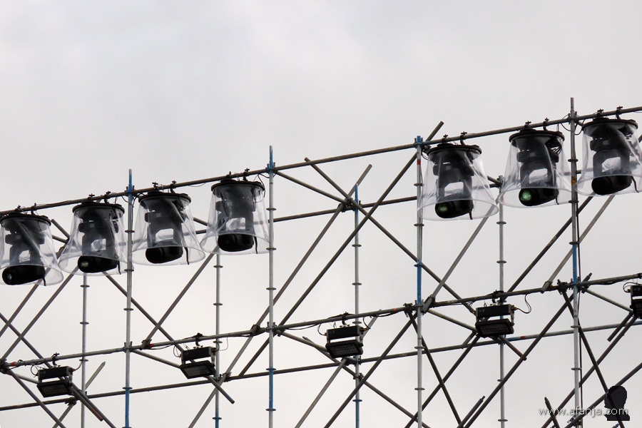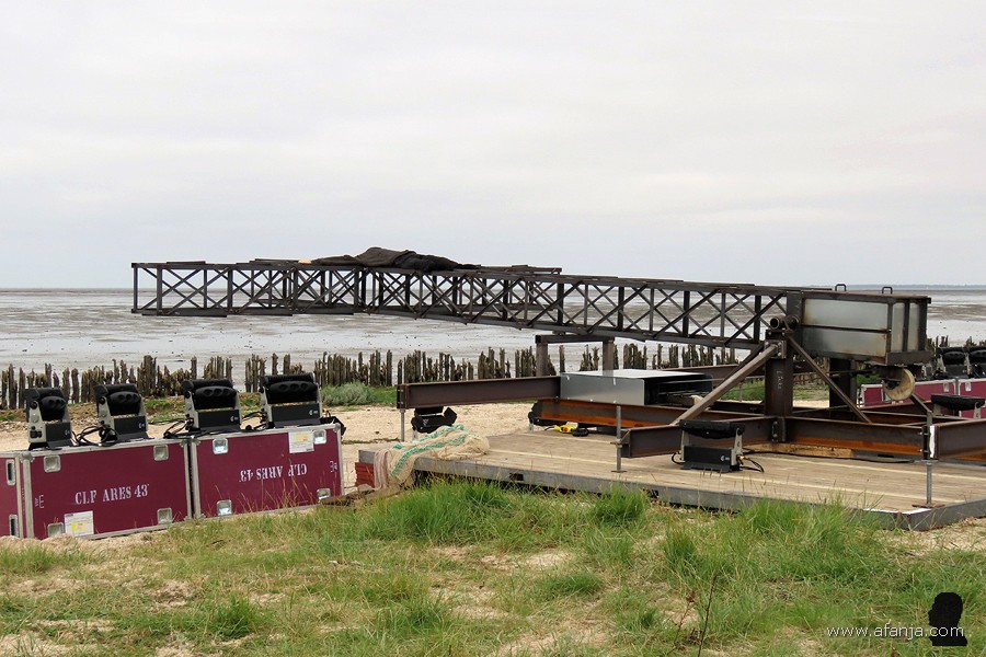 Maar ik moet toegeven, dat ik die brug toch knap hoog begon te vinden, toen ik aan de voet van de trap stond. En even later van boven naar beneden kijkend – waar Jetske intussen ook aan de klim was begonnen – vond ik toch een knappe diepte. Maar het uitzicht over het operaterrein en de daarachter liggende Wadden, was dan wel weer heel mooi …