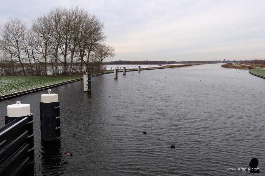 De vaarweg tussen Drachten en Earnewâld lag nog helemaal open. De laatste keer dat daar ook een mooie laag ijs op lag, was in februari 2012. Maar dat kon de pret niet bederven, want voorbij de bomen lag links van de Hooidamsloot een mooie ijsvlakte …