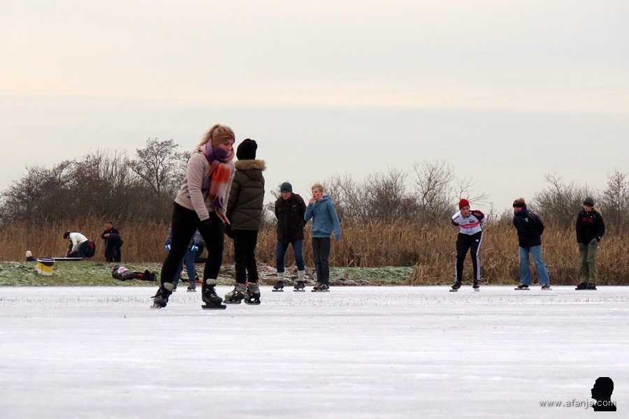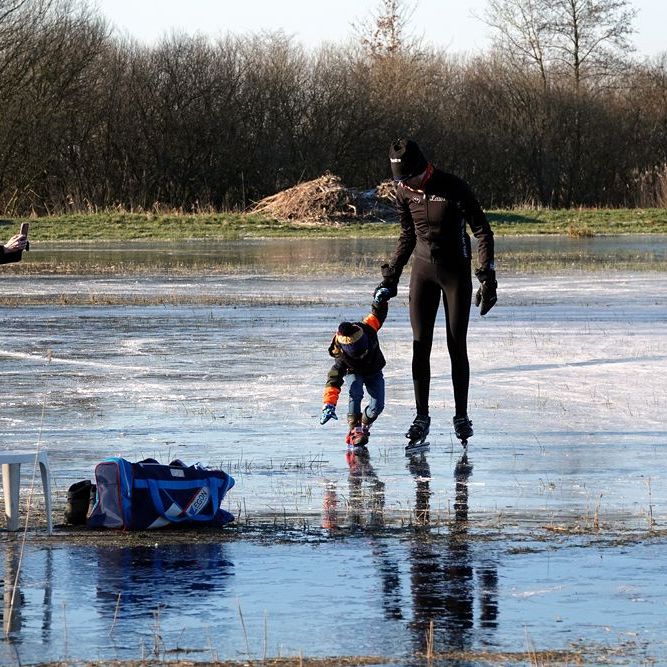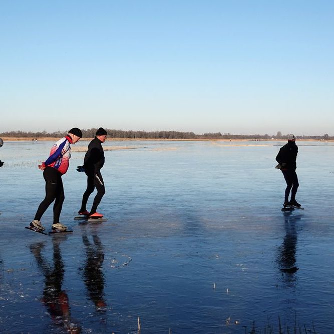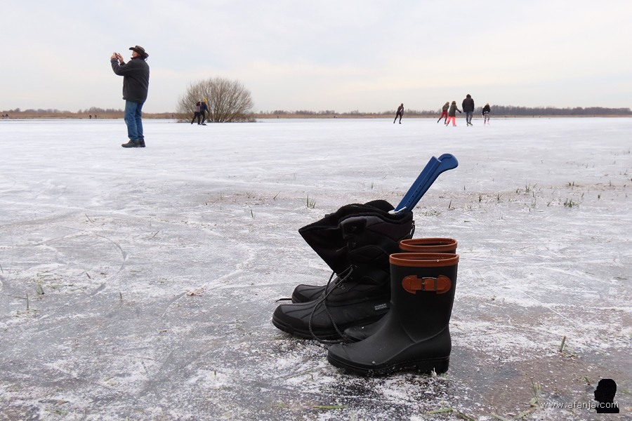 Zodra het schoeisel was verwisseld voor schaatsen, konden de eerste rondjes worden gemaakt. Nou ja, rondjes … het waren mooie ronden van naar schatting twee kilometer. Daar konden de liefhebbers die dag nog volop van profiteren en dat deden velen dan ook …