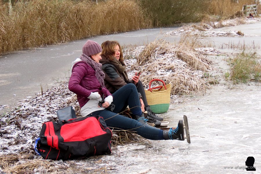 Na een paar van die rondjes was het voor menigeen wel tijd om de benen, die aan het begin van het seizoen nog niet gewend waren aan de schaatsbewegingen, even wat rust te geven. Dat was natuurlijk meteen een mooie gelegenheid om nog even iemand te bellen om te vertellen wat hij of zij miste …