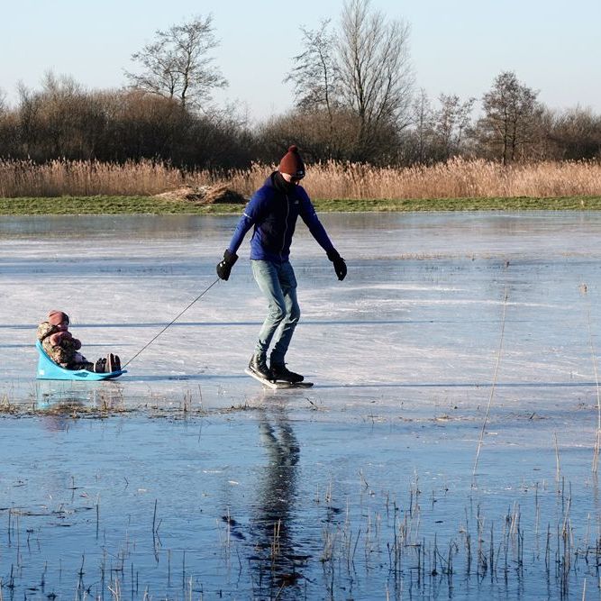 De echte liefhebbers waren er ook hier al vroeg bij woensdag. De ene jonge vader hielp zijn zoon om de eerst krabbelende streken op het ijs te zetten, een andere vader trok zijn nog wat jongere kind op de slee achter zich aan. Hij liet het zich met een brede lach op zijn gezicht welgevallen. Ook enkele grijzende schaatsers met intussen al wat lagere sixpacks maakten gezellig pratend hun eerste rondjes …