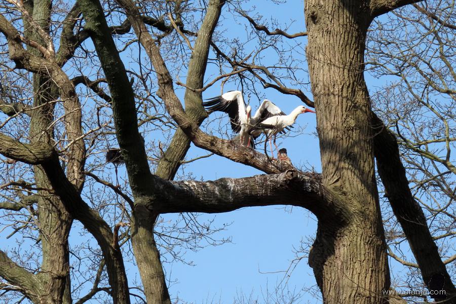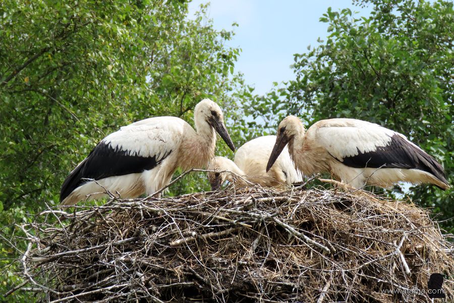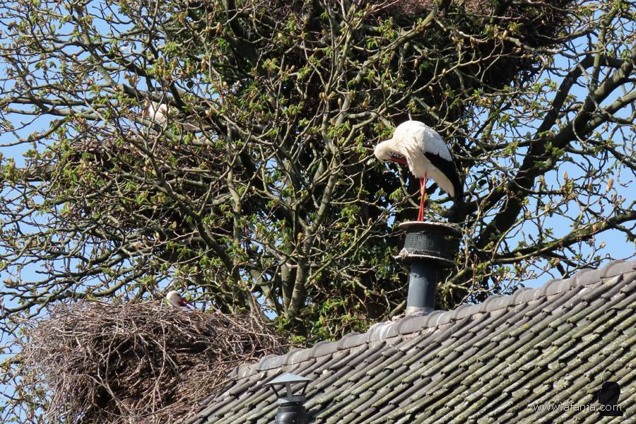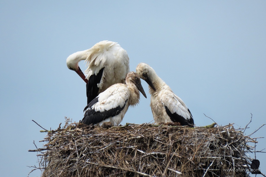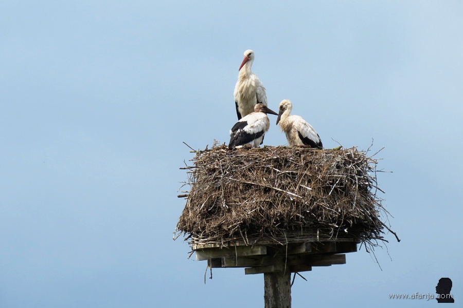 It is now more than three months since I told in Skywatch 458 that the storks at Earnewâld had returned from their winter quarters. Nature has done its job recently. In addition to the old storks, all inhabited nests now also have young ones …