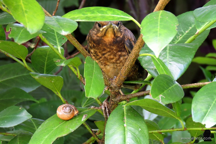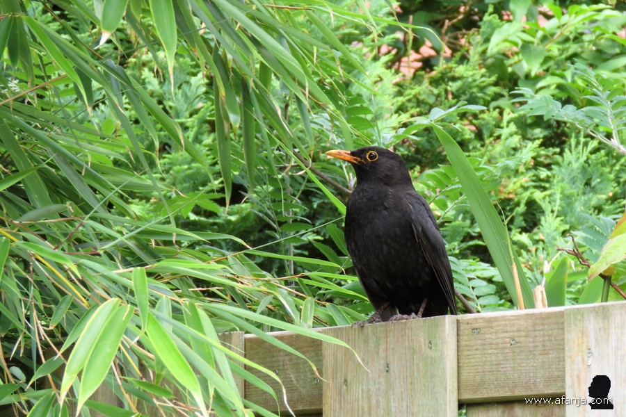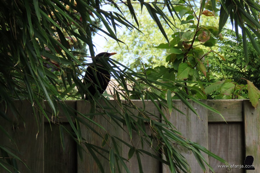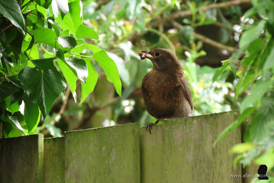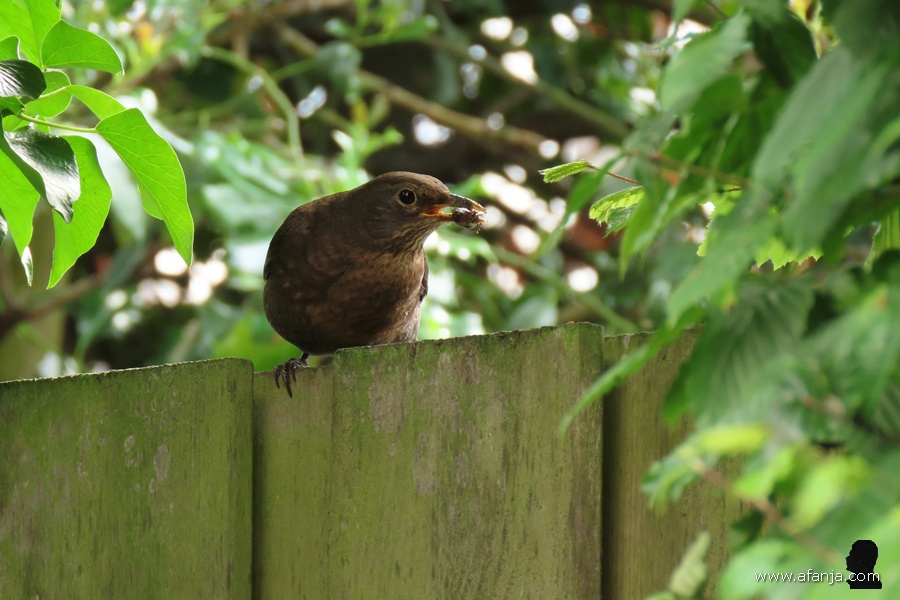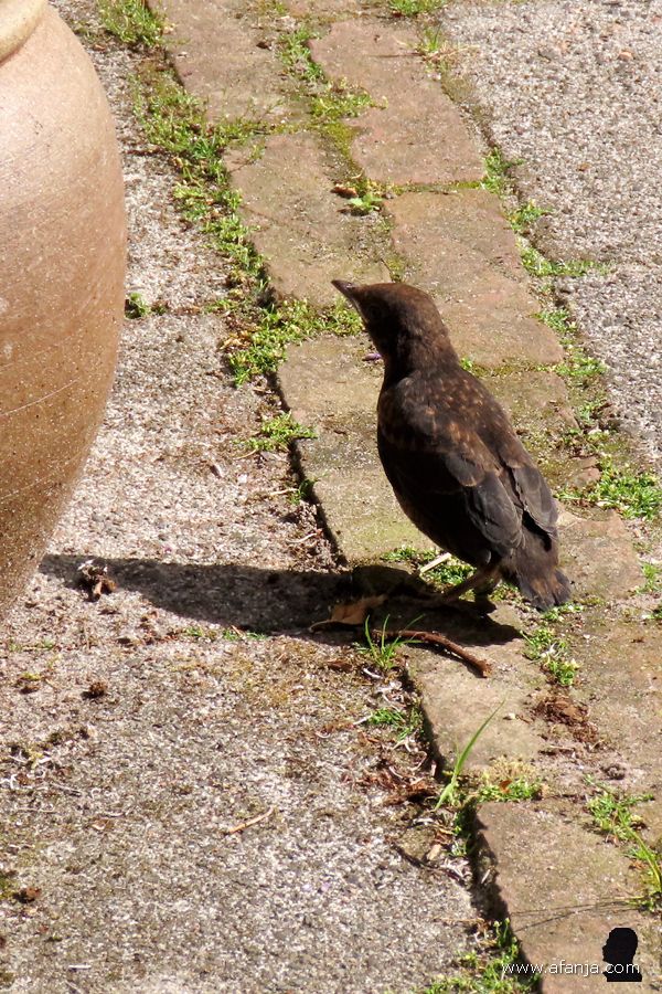 Tegelijk met de koolmezen verlieten ook de mereljongen zaterdag hun nest. Pa en ma merel hadden hun tweede nestje nu eens niet in de pergola in onze tuin, maar ze bouwden een nieuw nestje bij de buren. Dat vonden ze zelf kennelijk nogal verwarrend, want ze kwamen wekenlang regelmatig terug in onze tuin om hun jongen te voeren, terwijl die al die tijd bij de buren zaten. Ik was er wel blij mee dat ze zich regelmatig vergisten, zo kreeg ik ze tijdens hun zoektochten naar het nest en/of de jongen toch weer verschillende keren voor de camera …