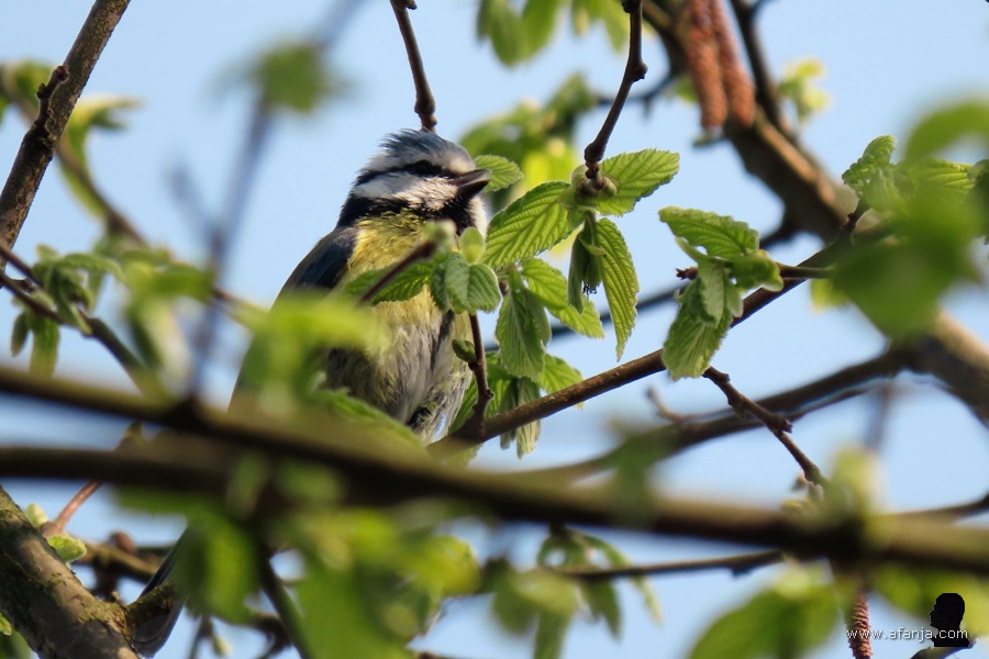 Het is een onderzoekend typje, dat pimpelmeesje van ons. Enige tijd geleden ontdekte hij dat de mast van mijn weerstation bestaat uit een holle buis. Hij klampte zich vast aan de onderkant en dook verschillende keren met zijn kopje diep naar binnen om te zien of daar wat te halen viel. Dat viel blijkbaar nogal tegen, want hij vloog al snel weer weg …