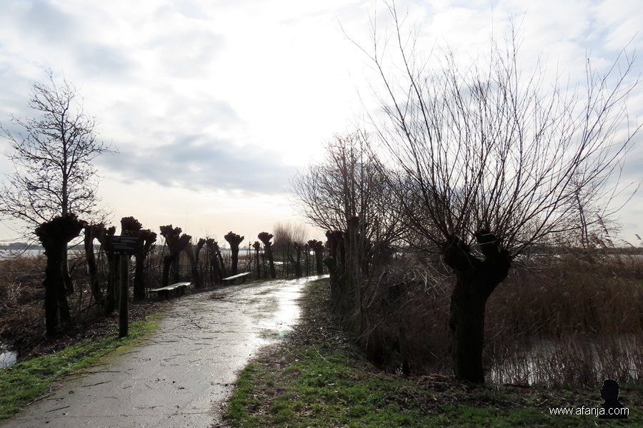 De Jan Durkspolder biedt met wat zon een heel andere aanblik dan laatst met sneeuw en ijs. Het met pas geknotte wilgen omgeven betonnen pad naar de grote vogelkijkhut ligt er glinsterend bij …