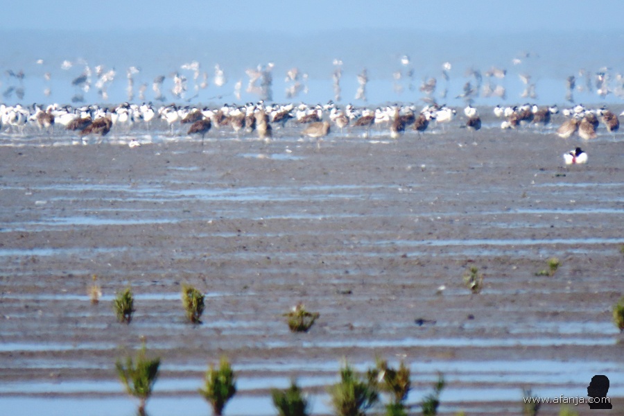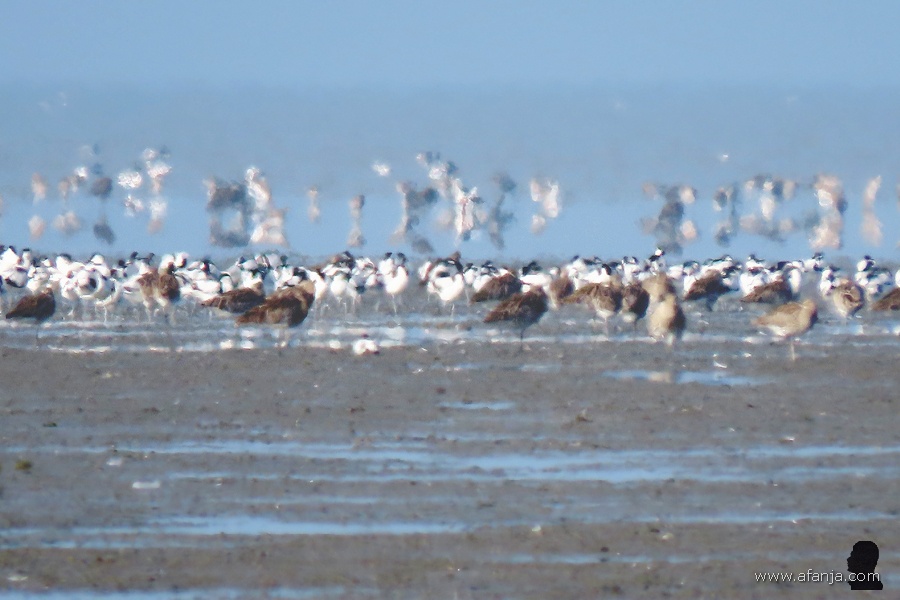 Ja warempel, daar waren ze … in de verste verte zagen we de kluten en hier en daar een andere Wadvogel zitten. Te ver om er echt iets mee te kunnen, maar Jetske had ze nu in lek geval kunnen zien …