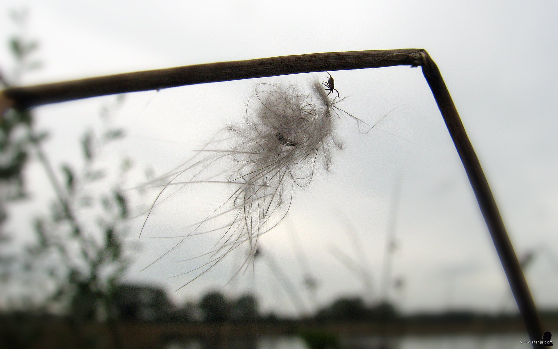Tijdens een korte rookpauze op het bankje tussen de twee vennetjes (Google Maps) ten zuiden van de toenmalige Nije Heawei zag ik tegenover het bankje een pluisje wapperen in de wind. Nadat ik de eerste foto had gemaakt, verscheen er plotseling nog wat meer beweging in beeld dan alleen het spel van de wind met het wapperende pluis. Een teek liet zich afzakken naar het pluizige spul. Nog voordat ik een derde foto kon maken, kreeg een windvlaag vat op het pluis, dat met teek en al werd weggeblazen …