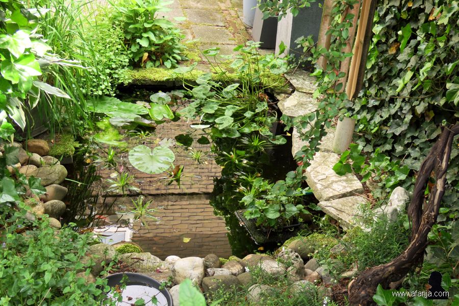 Gisteren werd ik in de tuin even verrast door een paar van de kikkers in onze vijver. Ze laten zelden van zich horen, maar gistermiddag was ik getuige van een gezellige tweespraak. De ene kikker zat in de vijver op een pompeblêd – dat is het blad van de waterlelie of de gele plomp – de andere zat vlak achter de vijver in de border. Ik heb geprobeerd om het geluid op te nemen, maar daar bleef door windgeruis en straatgeluiden niets van over …