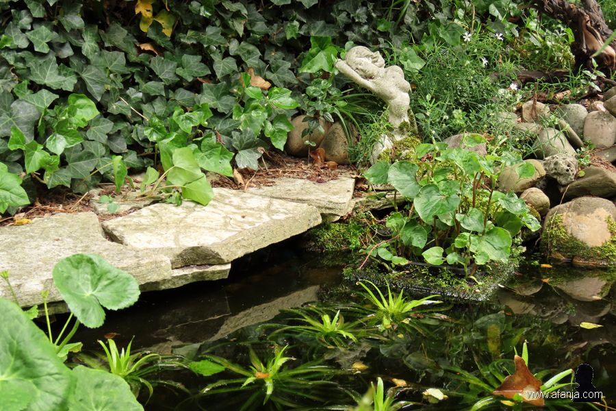Wel heb ik een mooie fotoserie kunnen maken van de kikker in de vijver. Hij stond toe dat ik hem van alle kanten ongestoord kon bekijken en fotograferen. Zelfs voorover buigen om een wat lager camerastandpunt te krijgen, verontrustte hem niet. De kikker die achter de vijver zat, sprong wel met een beschaafd plonsje de vijver in, toen ik te dichtbij kwam …