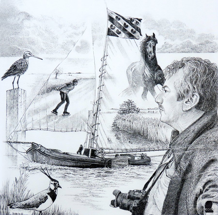 De tekening is gemaakt door Kirsten Krijthe, activiteitenbegeleidster bij Revalidatie Friesland en als zodanig inmiddels een oud-collega van Aafje, maar ook zeer actief als kunstenares. Omdat Aafje mij graag mee wilde laten delen in haar pensionering, heeft ze Kirsten gevraagd of zij een tekening van mij wilde maken zoals ik de afgelopen 15 jaar fotograferend door Fryslân gekuierd ben.