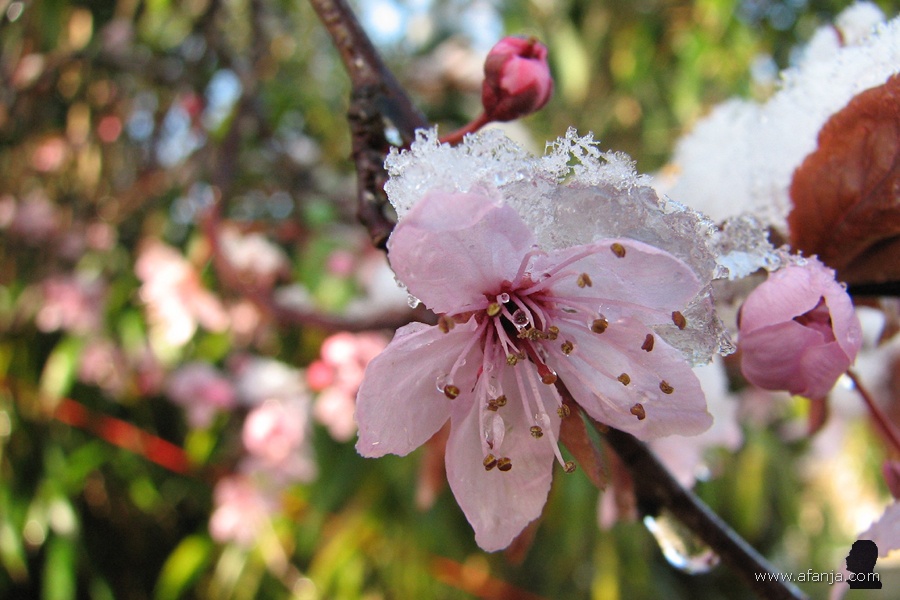 De prunus is in enkele dagen tijd tot volle bloei gekomen. De harde wind maakte het niet gemakkelijk om er mooie foto’s van te maken, maar deze kon er wel op door. Een koolmees bracht een inspectiebezoek aan de nestkast aan de hazelaar. Een huismus leek tijdens het ochtendbad nogal te schrikken: ‘Brrr … koud nog dat water …’