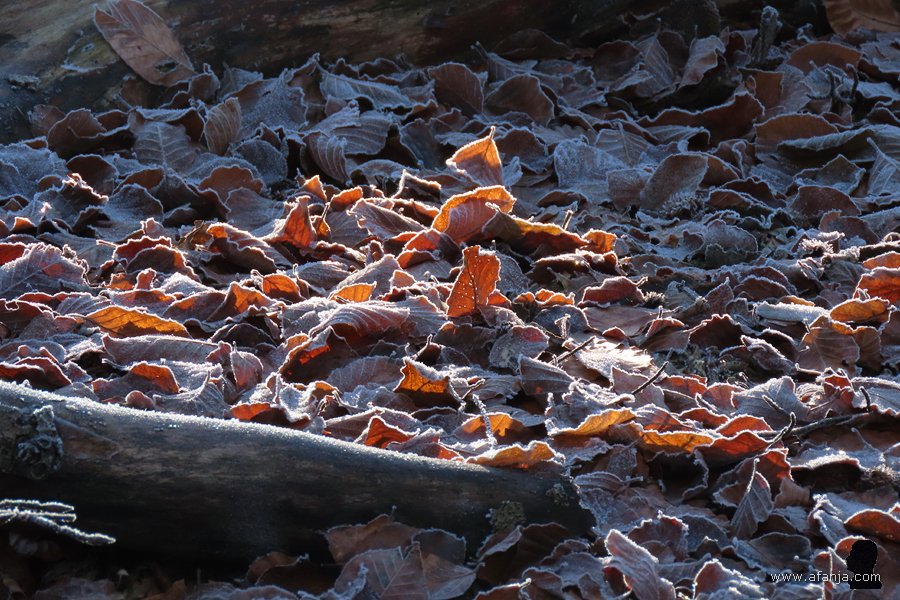 Het bos heeft zijn geheel eigen sfeer op een mooie winterdag. Een schilderachtig laagje sneeuw ontbrak, maar de fijne rijprandjes rond de bladeren op de bosbodem compenseerden veel. Zodra ik het fietspad verliet, knisperden de bevroren bladeren mooier dan ooit onder mijn voeten …