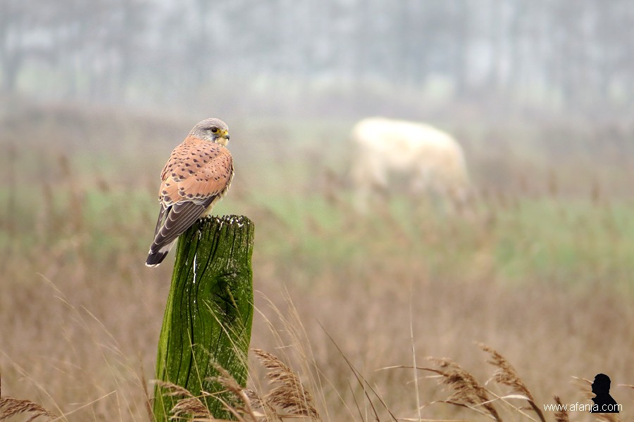 Ik stond er nog maar net, toen één van de torenvalken op het hek bij de windmotor neerstreek met een prooi in zijn snavel. Gelukkig voor de tere zieltjes onder ons, is de prooi op de meeste foto’s nauwelijks te zien, omdat er heel subtiel twee rietstengels langs de paal heen en weer wuifden …