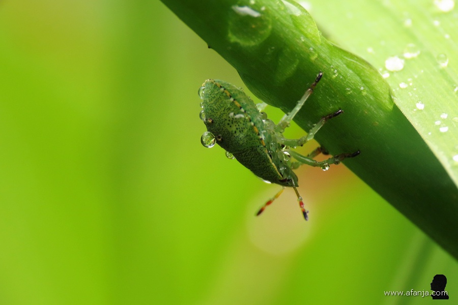 Ik zette een klapstoeltje bij de zinken tobbe naast de vijver en ging op zoek naar fotogenieke druppels op de langwerpige bladeren van de blauwe iris. Het eerste wat ik tijdens mijn zoektocht aantrof, was een wants die beladen met druppeltjes ondersteboven over een bloemsteel naar beneden liep …