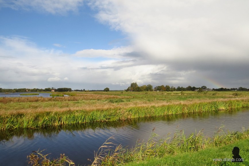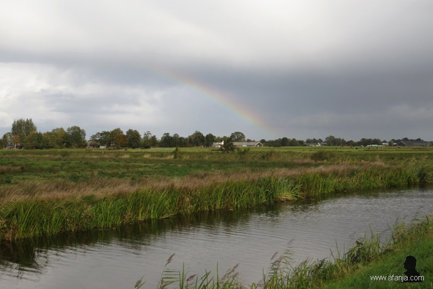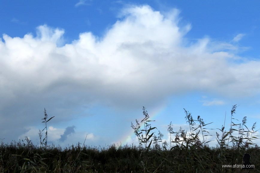 Het was een prachtige dag met fotogenieke wolkenpartijen van voortdurend om ons heen trekkende buien. Zodra we uit de auto stapten, verscheen de eerste van vele regenbogen die dag. Tijdens de wandelingen werden we o.a. verrast door mooie oude molentjes en een paar ranke reeën in het rietland …