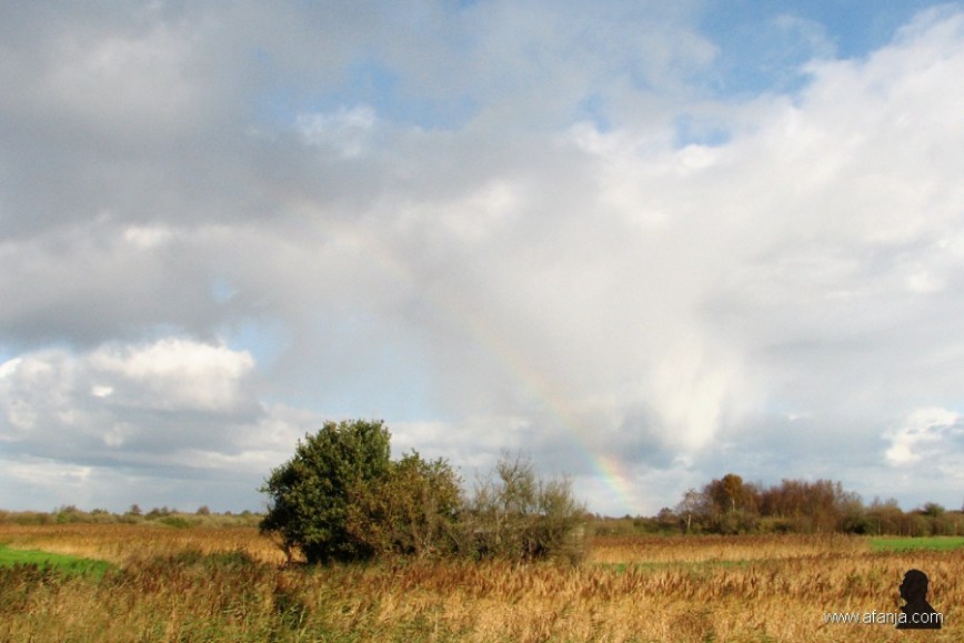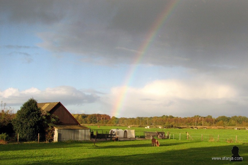 Terwijl ik aan het eind van de middag huiswaarts reed, verscheen er al na enkele minuten weer een mooie regenboog. Voordat ik de snelweg op draaide, zette ik de auto nog even in de berm om ook deze regenboog nog even vast te leggen. Een regenboog aan het begin en aan het eind van de dag, hoe mooi wil je het hebben …