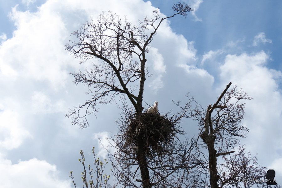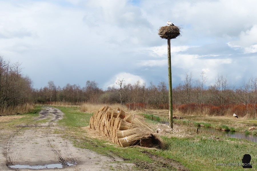 Ook dit paalnest was overigens weer bezet. Mevrouw ooievaar stond op het nest en haar eega stond op één poot aan de overkant van de sloot …