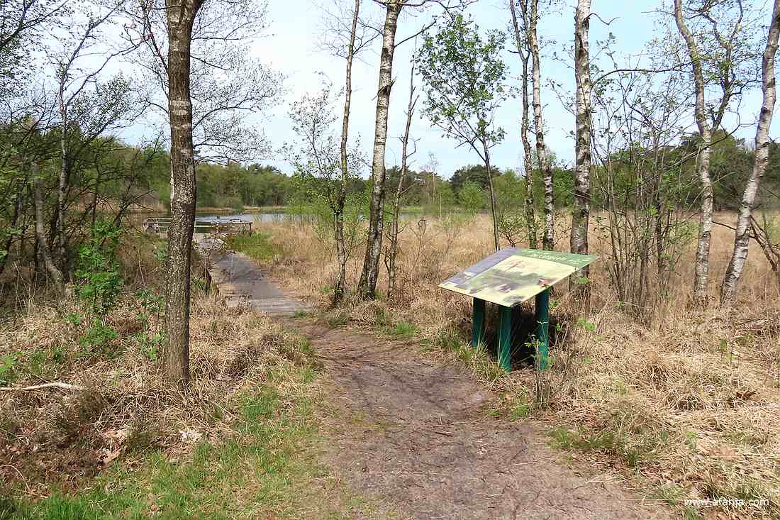 Terwijl Jetske vlot voorwaarts stapte, kreeg Whilly het meteen flink voor zijn kiezen. Om van het half verharde parkeerplaatsje af te komen, moesten we eerst over een stuk met gebroken puin, dat nog niet was gewalst of vastgereden. Maar goed, Whilly en ik bereikten samen de weg, die we meteen recht overstaken. Daar wachtte de volgende uitdaging. Het zandpad was door het droge en warme weer hier en daar bedekt met een laag stuifzand. Het viel Whilly zwaar om daar doorheen te ploegen. Nu eens naar links en dan weer naar rechts uitwijkend, zocht ik mijn weg over de hardste delen van het pad …