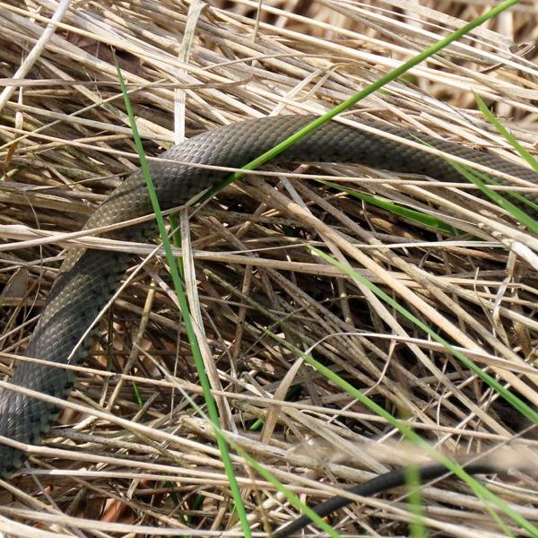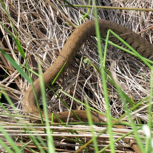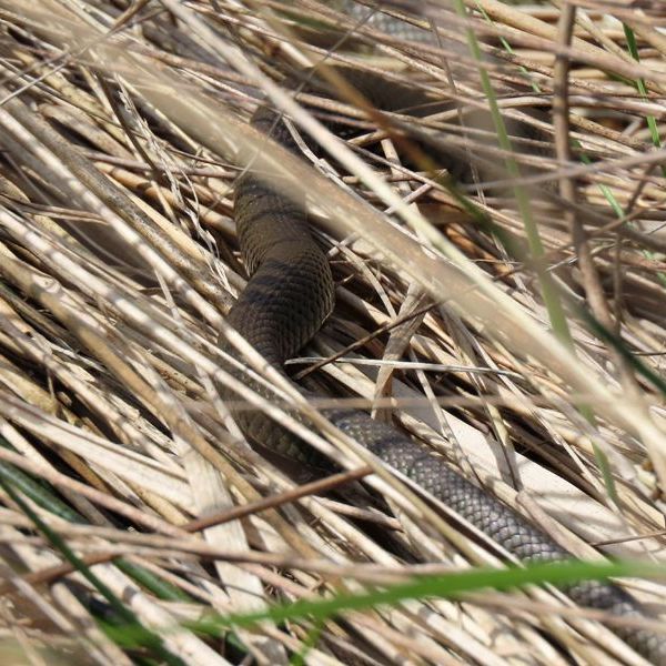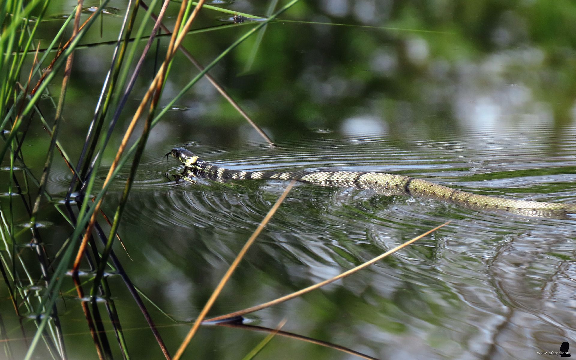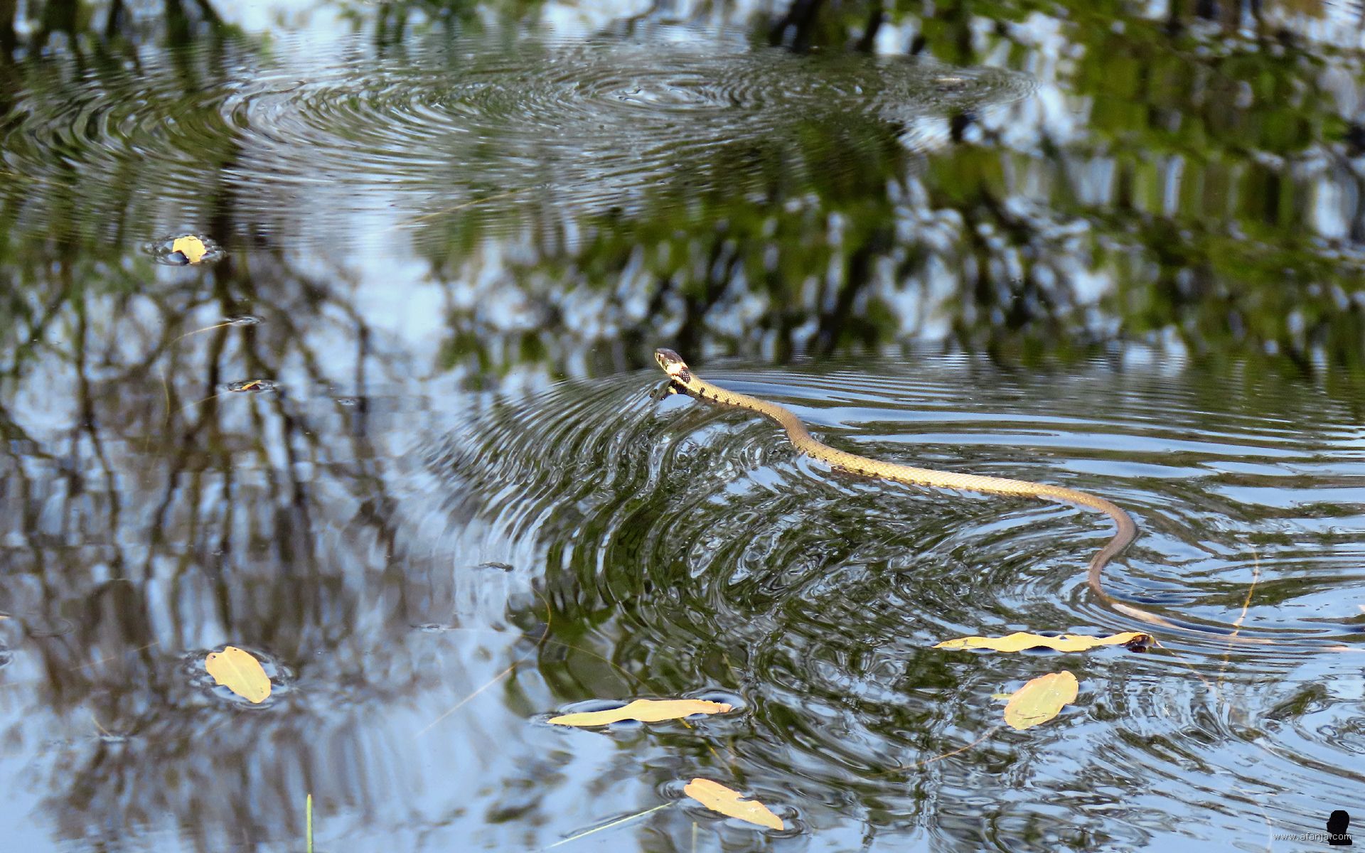 Dit is voor mij een mooi moment om even de tweede ringslang van die dag te tonen. De eerste ringslang was ’s ochtends van oost naar west over gestoken. De tweede zwom korte tijd later in tegengestelde richting vlak voor de vlonder langs. Dit exemplaar liet ook een paar maal zijn tastende en ruikende tong mooi zien …