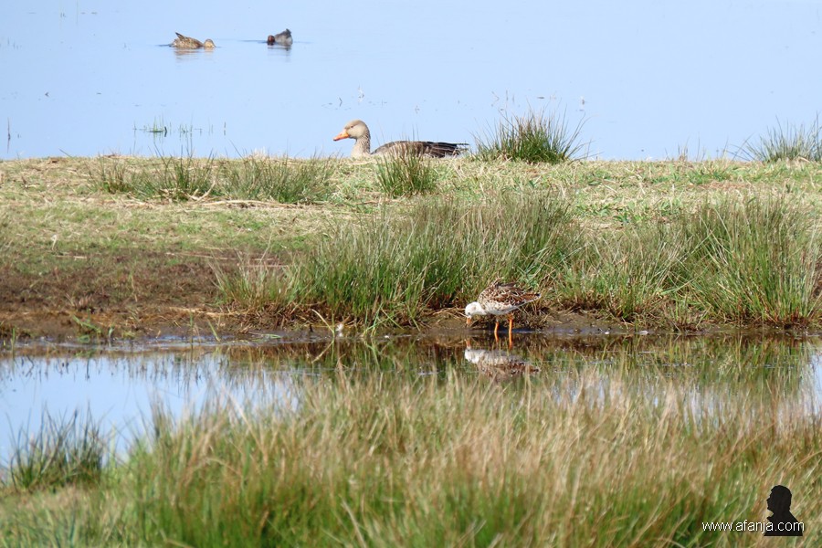 Fotogeniek was deze hoants, zoals de kemphaan in het Fries wordt genoemd, zeker. Zelfs zijn spiegelbeeld werkte voorbeeldig mee. Ik sluit dit drieluik over de kemphaan dan ook met een tevreden gevoel af. Toen ik ze vorig jaar op deze locatie voor het eerst zag, bleven ze een stuk verder weg. Dit is toch net wat bevredigender …