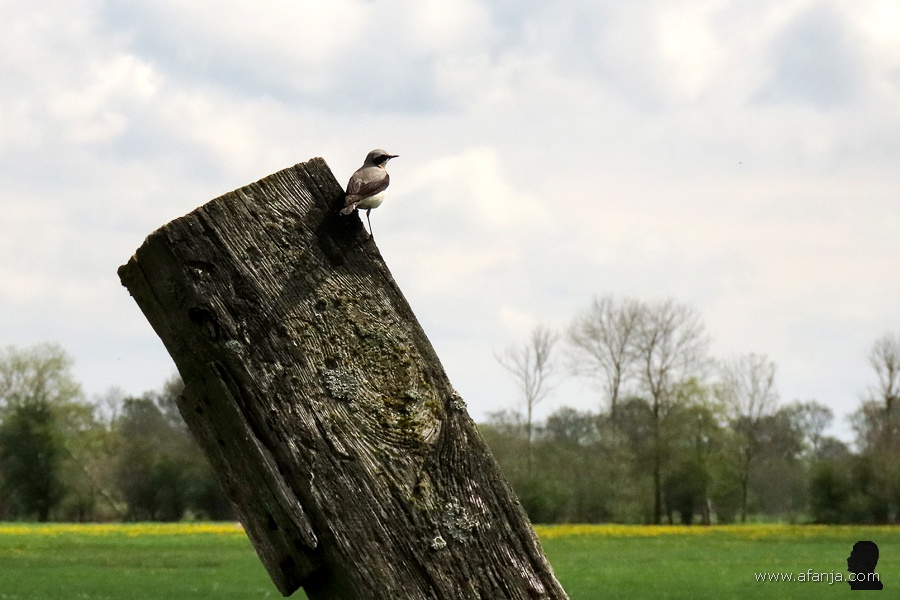 Dankzij het ontbreken van die koude wind kon ik er zelfs weer een stukje tussen de groengele weilanden wandelen. Dat maakte het ook mogelijk om deze graspieper stilletjes te benaderen, terwijl hij prinsheerlijk op de paal met het bord van Staatsbosbeheer om zich heen stond te kijken …
