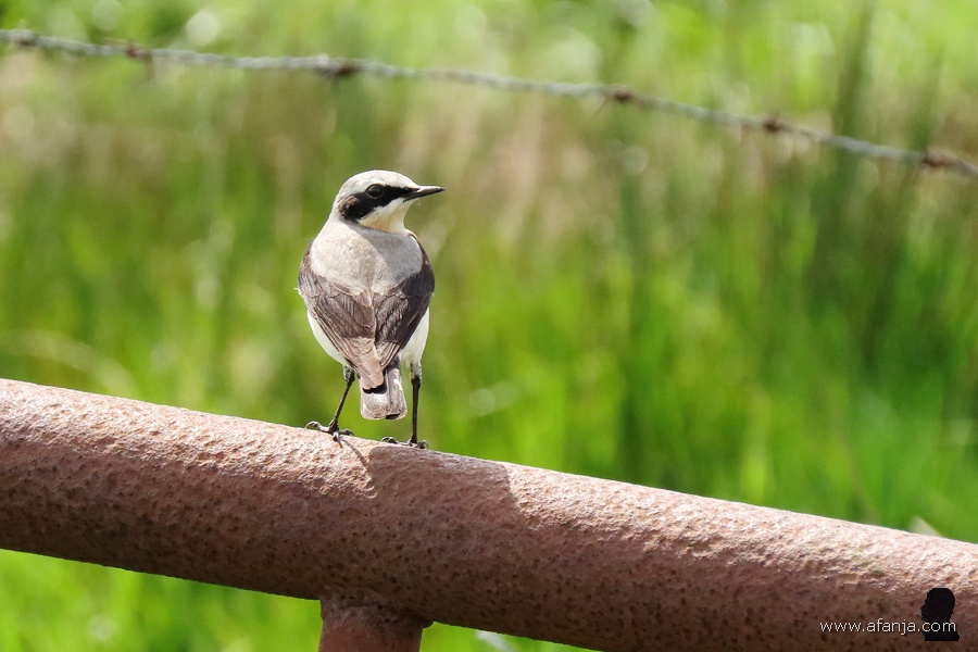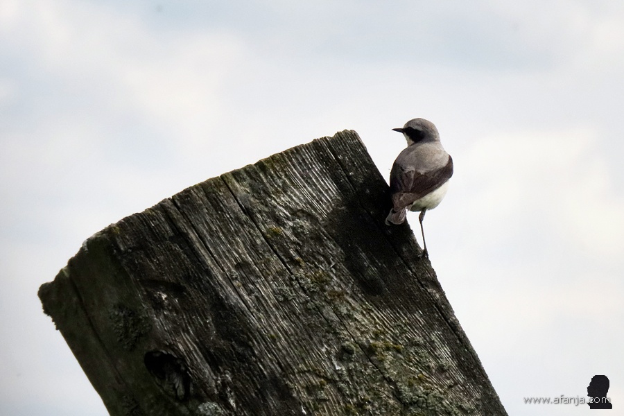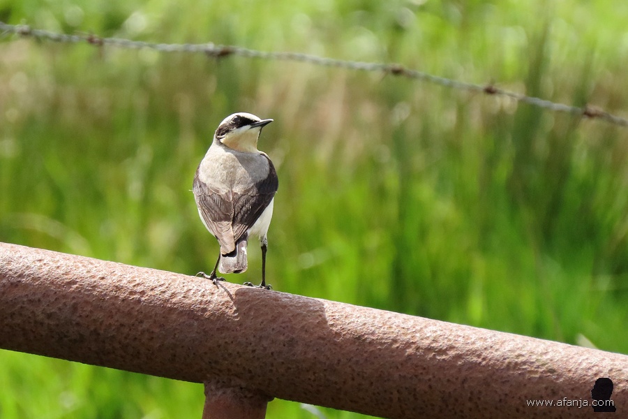 Zodra ik hem in de zoeker had, meende ik hem te herkennen. Het leek een tapuit te zijn (heidehipper in het Fries), en daarmee had ik weer eens een primeurtje. Ik heb het nog even nagekeken, tot dat moment had ik – voor zover bekend – 85 vogelsoorten in mijn fotoarchief. De tapuit is dus nr. 86. Nadat ik twee foto’s van de tapuit op die grote dampaal had gemaakt, leek hij het welletjes te vinden en vloog hij naar een hek een stukje verderop …