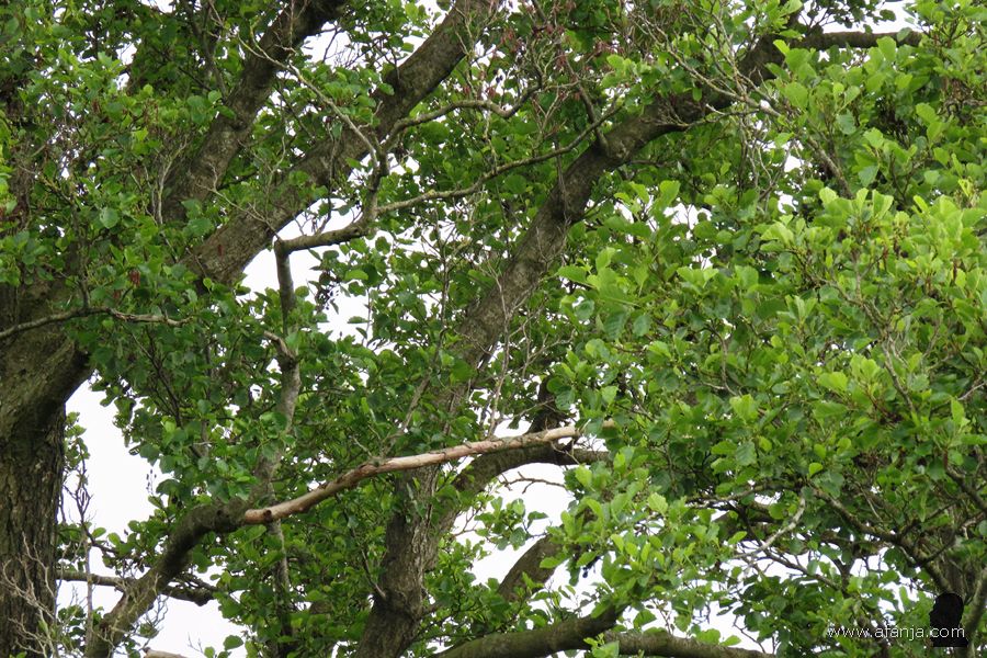 Hij had hem alleen nog niet kunnen zien, daar bracht hij echter verandering. Behalve een fiets had hij ook een verrekijker meegenomen. Daarmee wist hij de vogel te lokaliseren, vertelde hij even later. Maar hoe goed hij ook zijn best deed om ons het juiste takje aan te wijzen, Jetske en ik kregen hem niet te zien …