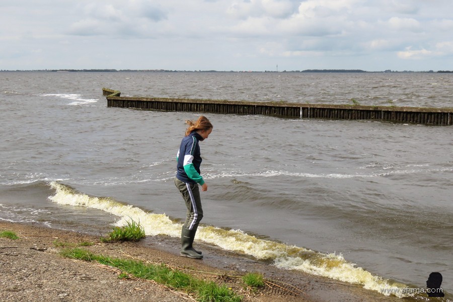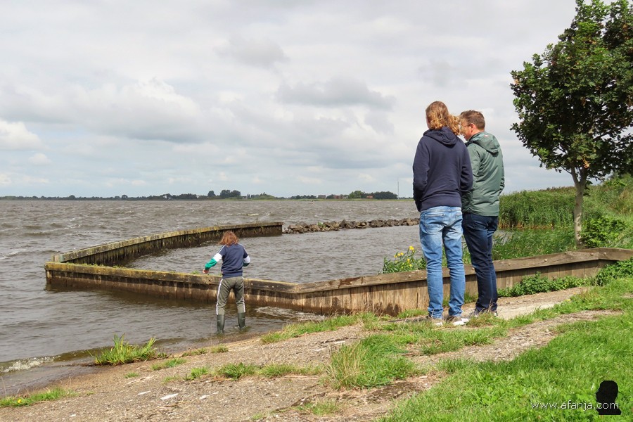 De eerste tussenstop maakten we korte tijd later op de oostelijke oever van het Tjeukemeer. Aan de Marwei is een parkeerstrook waar ik graag even aan de waterkant zit. Voor de beweeglijke Pepijn was dit een welkome gelegenheid om even de benen te strekken. Hij was meteen onder de indruk van de oppervlakte van dit grootste van de Friese meren, een plas waar het lelijk kan spoken …