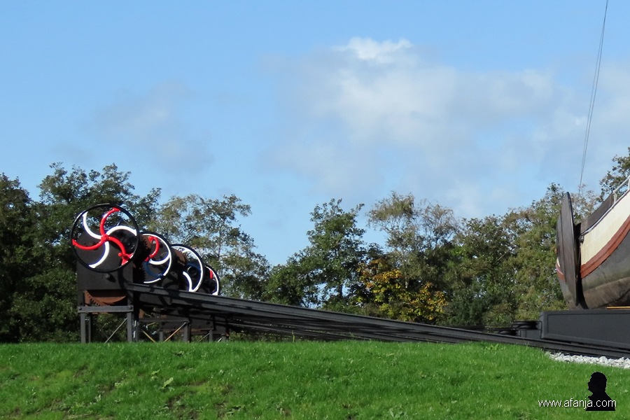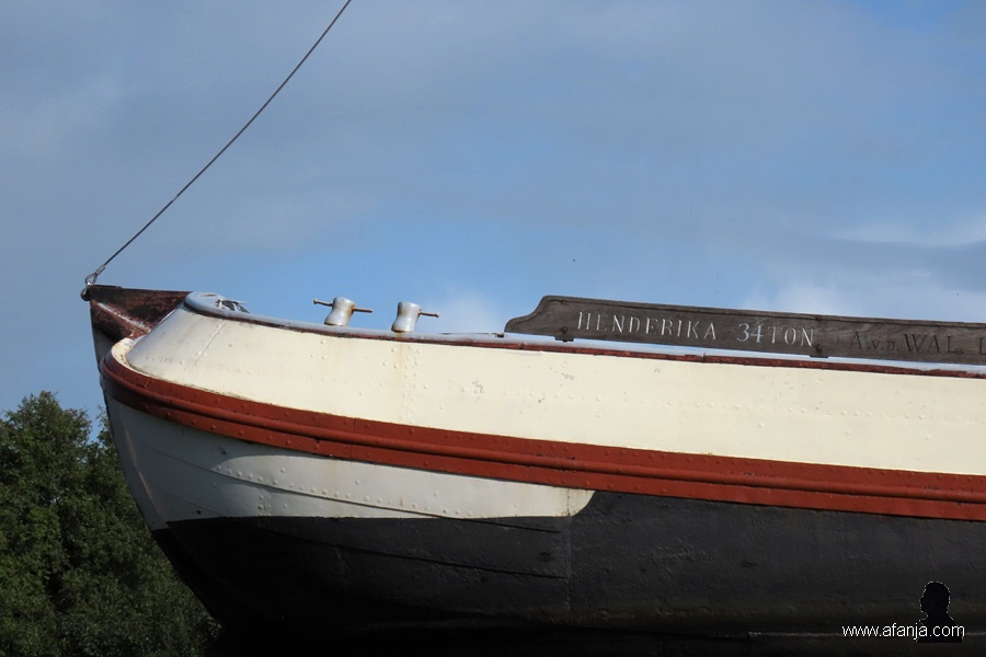 Daarbij komen we aan de oostkant langs de scheepshelling. De waarheid gebiedt mij te zeggen, dat mijn kennis op het vlak van scheepswerven en -hellingen aan alle kanten tekort schiet om hier verder iets zinnigs over te kunnen zeggen. Ik zie roestige karren met verweerde blokken hout op rails staan, die m.b.v katrollen en/of andere hijswerktuigen omhoog getrokken kunnen worden …