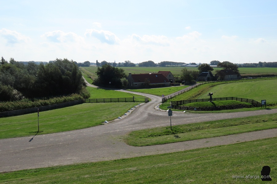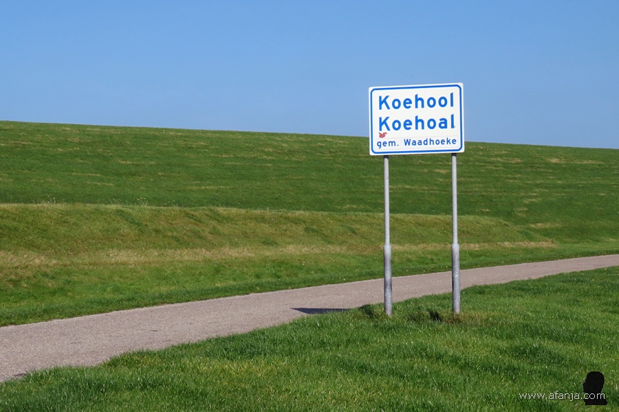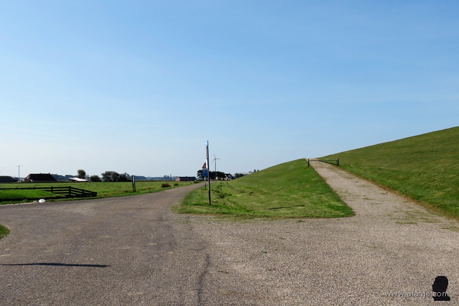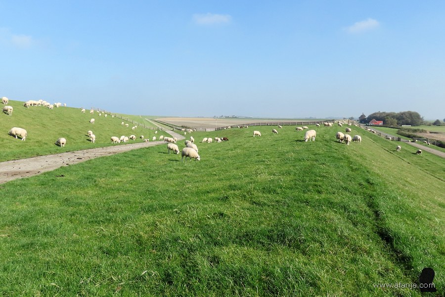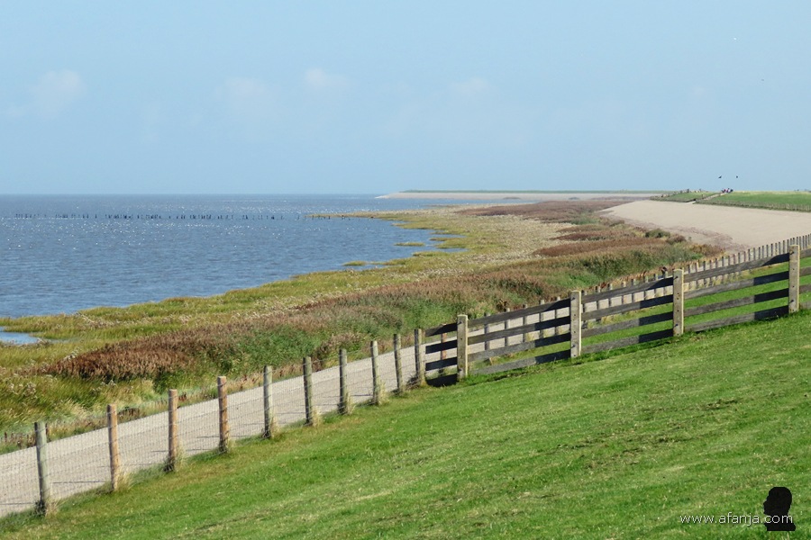 We laten de kwelder bij Koehool achter ons en dalen de nieuwe zeedijk af. Op de foto hieronder zien we links de nieuwe zeedijk en rechts de enkele meters lagere oude dijk …