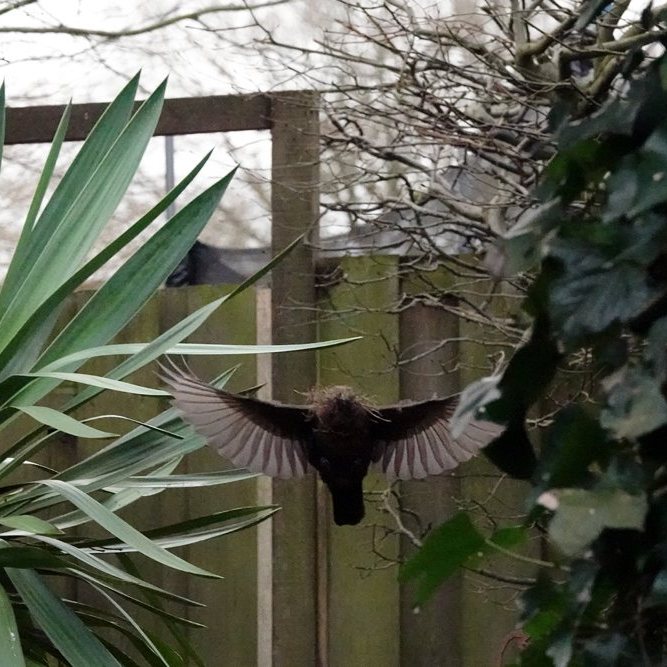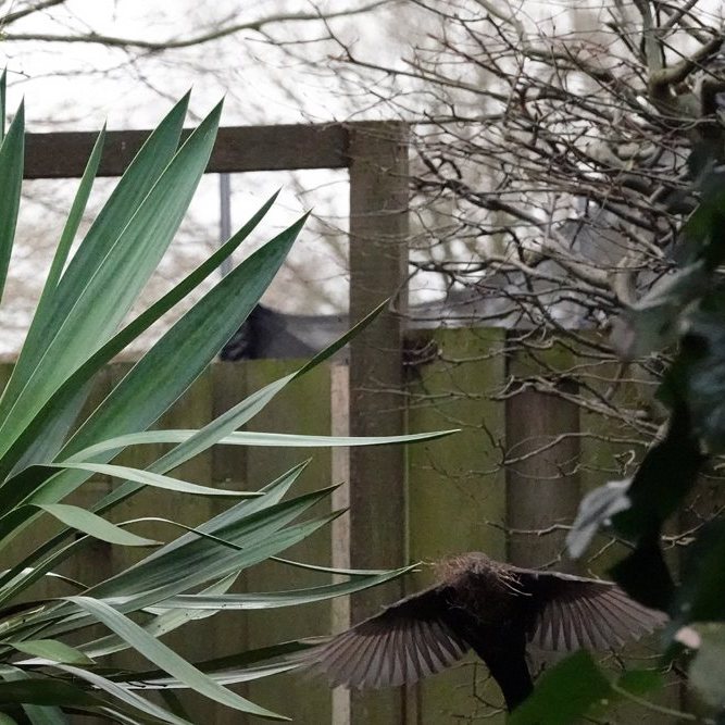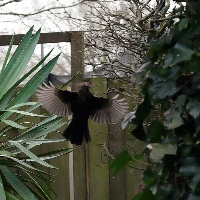 De heer en mevrouw Merel hebben de pergola boven de vijver in onze tuin ook dit jaar weer uitgekozen om een nestje te bouwen. Ze vliegen al ruim een week af en aan met bouwmaterialen. Daarbij heb ik ze er intussen op betrapt dat ze net als meerkoeten plastic afval gebruiken. Onder andere de onderste rand van een plastic zakje en een pakweg 40 cm lange witte nylon strip, waarmee dozen worden dichtgebonden, werden meegenomen …