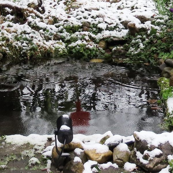 De sneeuwjacht hield zo’n 24 uur aan, maar leverde hier uiteindelijk gemiddeld toch niet meer dan ca. 6 cm sneeuw op. Ons vijvervrouwtje was maandag 8 februari nog maar nauwelijks zichtbaar …