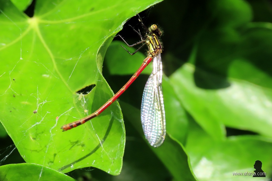 In onze tuin kwam kort geleden een vuurjuffer vast te zitten in wat spinrag op de klimop. Hij zat helemaal niet zo vast, maar desondanks lukte het hem niet om los te komen. Integendeel, hij leek het eerder erger te maken met zijn gekronkel. Daarom besloot ik toch maar even in te grijpen. Met een klein twijgje was het een fluitje van een cent om hem te bevrijden. Hij vloog meteen naar de top van de klimop rond de pergola. Daar kon ik nog een laatste close-up maken, daarna verdween hij uit zicht …