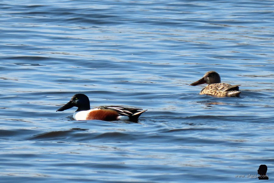 Een paar slobeenden zwommen met hun grote snavels wat voor de kijkhut heen en weer …