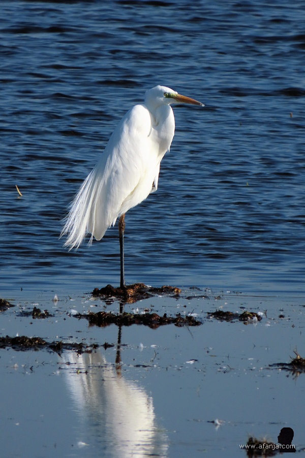 Een grote zilverreiger stond met opwaaiende kuif tussen de grauwe ganzen op het bijna droog vallende deel aan de oostkant van de vogelkijkhut …